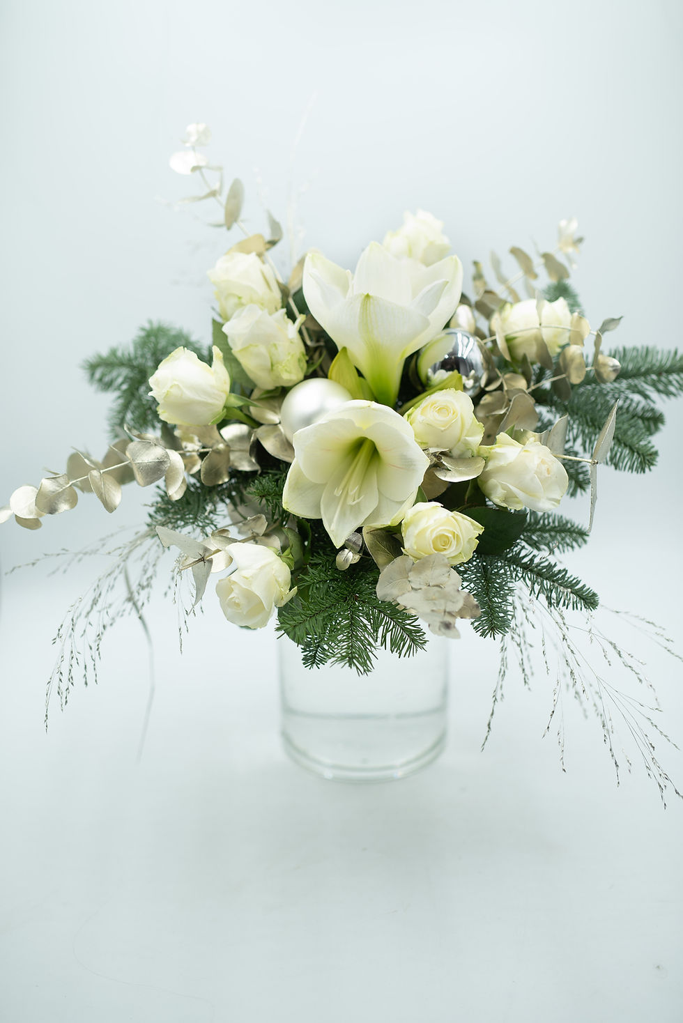 Hautavihkossa on vaaleanpunaisia neilikoita, suloisen tuoksuvia valkoisia freesioita ja rakennetta tuovaa skimmiaa. (Skimmia voidaan korvata populuksen marjoilla). Vihkossa on runsaasti erilaisia vihreitä.